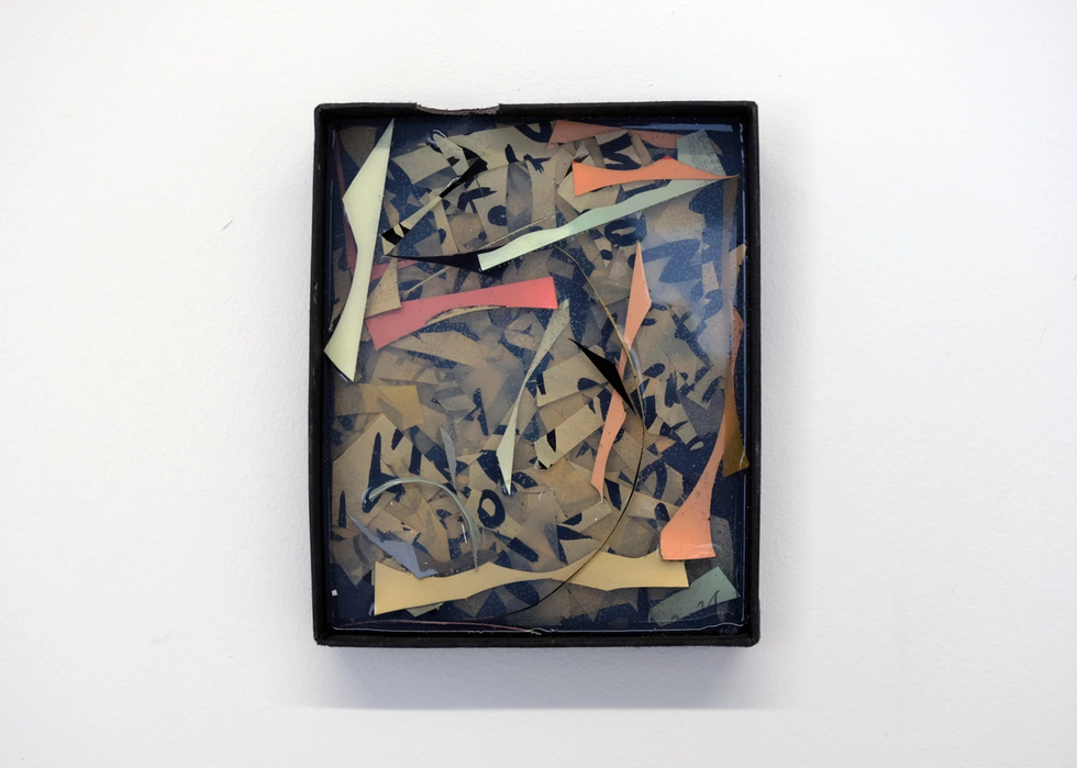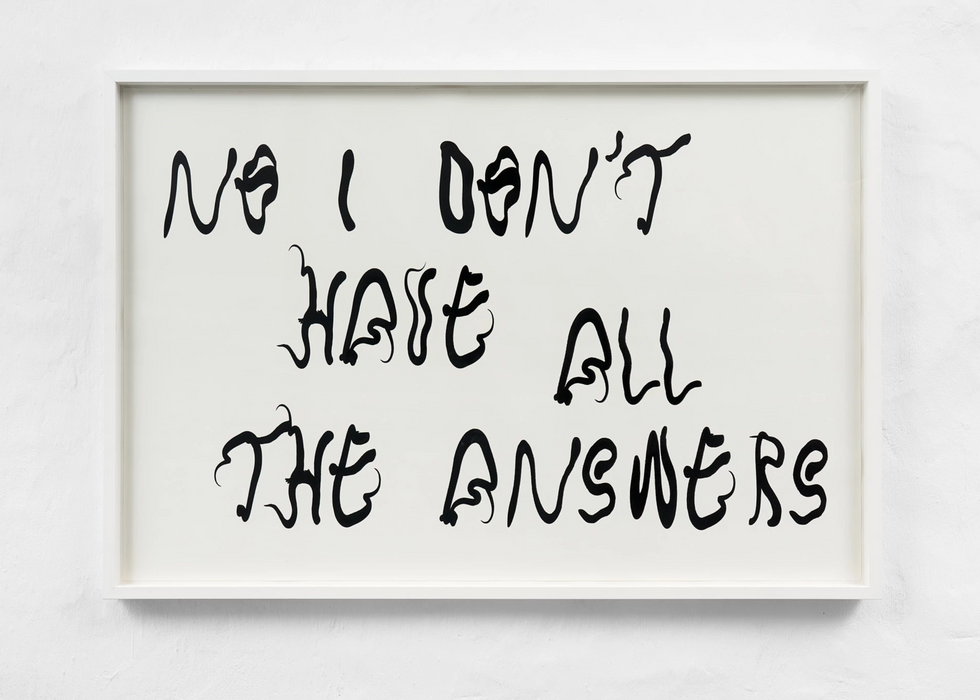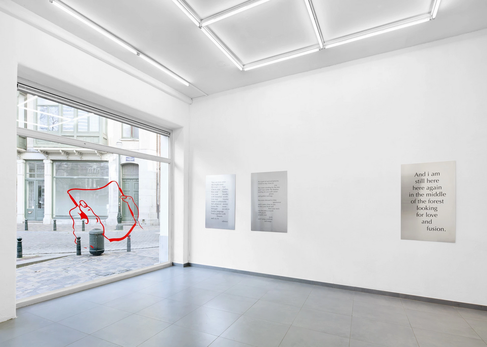 'A, letter' brings together the work of French artist Tarek Lakhrissi and British-Bermudian artist Charlie Godet Thomas, both of whom explore poetry and make use of the grey areas between writing and visual art. The exhibition is on view from November 10 - December 11, 2021 and is presented in collaboration with VITRINE (London, Basel). The exhibition focuses on the notion of correspondence, that of the two artists, but also between the work and the audience. In preparing for the exhibition, Lakhrissi and Thomas explored the mutual ground they occupy through both fast and slow technologies. Working in separate continents – Lakhrissi in Europe and Thomas in North America – the artists were unable to meet in person; this space became their focus. 'A, letter' is a conversation that holds some of the distortions inherent in not being able to communicate in person; the inevitable distortions of miscommunication, paired with new and unexpected ideas that can blossom from distance. Both artists write poetry which is incorporated into their work alongside sourced text. This combination of sources creates a poly-vocal exhibition which can be read like a cut up, non-linear text, containing an aesthetic claim for the way texts are presented and therefore communicated visually. Lakhrissi's aluminium tablets 'Home', 'Fusion' and 'Whisper Secrets' were commissioned within a larger series for the artist’s first institutional solo show in the UK 'My Immortal' at MOSTYN, Llandudno, UK, earlier in 2021. These works are reflective metal plaques inscribed with poems written by the artist about desire, loss and personal mythologies, becoming commemorations for different members of his close community. The text is UV printed onto the aluminium surface, a process that uses ultraviolet lights to dry or cure ink as it is printed. Lakhrissi gives space to poetry as an artistic statement through diverse mediums. His profound use of language is evident in the tablets, reflecting on queer past, present and futures to become mediations on the ephemerality and fragility of communal love, friendship and the power of intimacy. Accompanying these works, is a resin sculpture that embodies the shape, colour and texture of the body organ associated with speech and digestion; the tongue. The piece takes cue from poète maudit Justin Chin's writings, which describe a tongue-in-action not assisting violence, but instead gesturing towards a field of potentiality. In a text about the work, writer Edwin Nasr has likened this work and body part to a jellyfish describing the "gooey oceanic species that brush against you and release painful stingers when they care and desire, as any loving stranger with a Mars in Scorpio would". The work on paper 'Serpent Dream' continues this animalistic enquiry in the form of a large scale screen-print on hard paper, which is exhibited for the first time since being produced in 2019. The minimal monochrome print reads 'NO I DON'T HAVE ALL THE ANSWERS' in a unique wavy font created by Valentin Bigel, inspired by the shapes of snakes. The text is a quote from French writer and philosopher Édouard Glissant and expresses a right of opacity. Based on a real altercation in a Parisian suburban train with police officers, the 'Serpent Dream' project, which this work is derived from, is a way to find new ways of expressing forms of sadness and reverie in relation to structural social violence. Thomas’ three new works in the exhibition were produced over 2021 in Mexico City. His two large paintings on paper, 'Enjoy Your Visit' and 'Stop by Again Soon' derive from a set of short biographical poems which were changed from the first person in order to bridge the gap between the writer, the audience and the experiences and ideas expressed. Both works explore various struggles with worsening mental health. 'Enjoy Your Visit' includes a metaphor of printmaking to allude to pressure and the resulting psychological and physical fragmentation it can cause. This fragmentation is portrayed by the artist's pencil marginalia at the bottom of the work which refers to one of the most famous fragmented paintings 'The Execution of Maximilian' (1867) by Édouard Manet, and might be seen as a hand reaching from Thomas, in Mexico, to Lakhrissi, in France – Maximilian was installed as emperor of Mexico in a European-style monarchy backed by Napoleon III of France. 'Stop by Again Soon' explores the use of alcohol by those seeking to control anxiety or other disorders through self-medication. The work is informed in part by the tragic personal histories of writers such as John Berryman (who’s presence is consistent in Thomas' past work), as well as figures such as Carson McCullers, Elizabeth Bishop and Dylan Thomas. The work might be seen as a lament for those who succumbed to addiction and a call to arms for those who are still here fighting. In both works, Thomas inverts the negative space so important in poetry, instead carving the letters out from the blank page, overwhelming the reader instead with the “black cloud” of his inverted image and text. Thomas' third work 'Fix' is a smaller version of previous works in which the artist casts paper and card fragments from earlier works, notes and sketches. He sees these as discarded letters, words or sentences that can later resonate in a different context, which are kept in boxes according to approximate size as a jumbled existing vocabulary he can take from. The use of fragments and offcuts is an extension of the artist's desire to focus on subjects which might otherwise be seen as peripheral or not of value, and a testament to his belief that often, when we are trying to focus on one thing, more interesting subjects can arise in the margins during the process, and that these deserve our attention. The offcuts are the material manifestation of that process, belief and method. Both artist's have collaboratively produced a vinyl artwork mounted on the window at the