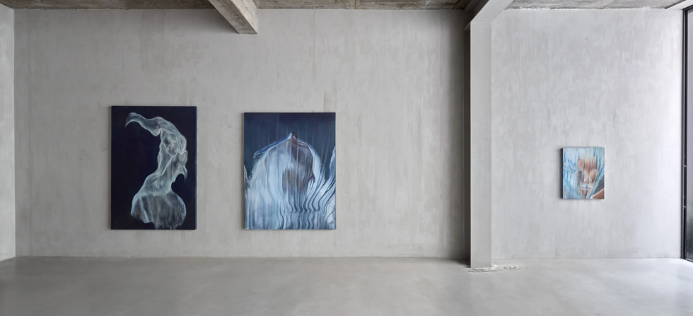 Narratives of self-existence have not historically included women, queer, or trans bodies with equal agency as male figures, thus resulting in restricting constructs of identity and self-worth. In Peripheries, a group exhibition featuring artists Anthony Cudahy, Liang Fu, Erin M. Riley, Maddalena Tesser, Keioui Keijaun Thomas and Kristian Touborg societal norms of selfhood are challenged through representation, while the body emerges as a site for exploration and transcendence. Wielding a diversity of visual practices, the artists present works where figures loom large and abstractions give way to representations of the corporeal. The exhibition is unveiled through painting, performance, assemblage, and textile works. Oil, acrylic, and watercolours on canvas reveal a plethora of ideas waiting to be discovered; intimate contradictions of the self, transformation through memory, and healing trauma through the body. Digitally printed fabrics, weaved and hand-dyed tapestries, and a single film coalesce emotively, inviting viewers to imagine the limitless potential of the body as both a tool and a subject. Many of the artists presented seek to circumvent limiting social principles of belief by sharing untold stories, and celebrating the emotional fragility of the human experience. Each artist, in their unique practice, works to upend that which we think we know about ourselves and the world. Anthony Cudahy and Kristian Touborg root their respective practices in depictions of the figure, oftentimes, enveloped in elusive dreamlike environments. The surrounding interiority gives rise to an ethereal quality where imagery hints at a pointed narrative that is often implied, not explicitly stated. Cudahy depicts images of human transformations as he ruminates on romance and intimacy through the lens of queerness. With a practice that references vernacular photography, Cudahy incorporates art history, gay iconography, and personal stories into his work. Touborg illustrates figures as they emerge and fade in colourful compositions. A montage of textures and colours expand and reconstruct his canvases, often of unusual shapes. Whether through abstractions that subtly hint at the figure or through arrestingly detailed representations, ideas relating to the body have always been central to Touborg’s practice. In Void Portal, 2022, a lone figure lies on a bed, tranquil and serene. A large vase with flowers dominates the foreground while the perspective and scale lend itself to the surreal. A richly saturated domestic scene is illustrated in piercing magenta and purple. Here, the artist combines classic mediums with contemporary tools. The surface of the canvas appears to weather strange and uncanny effects due to Touborg’s processes of manipulation of digitally altered fabrics and industrially treated materials. The works evoke provocative sensations where the familiar and foreign coalesce. Liang Fu presents hauntingly detailed watercolours where the figure evolves through abstraction. Each work begins with investigations in form, colour, and texture as pigments are applied to canvases before tiny droplets of water are added in slow methodical steps. Fu dwells in the comfort of uncertainty where an interplay between transparency and the opacity of colours are displayed. In Evaporation, 2022, a chilling white-eyed face commands the canvas. Streams of transparent blue and white water envelop the figure as a sombre expression is unveiled through the interplay of watery light and shadows. Explorations of womanhood are intimately explored through the work of Erin M. Riley and Maddelena Tesser. Tesser has built a practice rooted in painting and drawing that subverts reality through imaginary narratives of self-actualizing identity and transformation. On the contrary, Erin M. Riley centres her lived experiences and her body, through self-portraiture in skillfully detailed hand-woven tapestries. Self-portraits are integral to the work, as she reveals the ways in which childhood trauma has led to growth. “Implicating myself,” she says, “was a natural progression from using images of other folks.” In Reflections 6, (2019), we see a reflection of Riley’s tattooed back and posterior in a black thong. Her face is hidden from view, as long black hair weaves down her back. The imagery is sexual and erotic, yet tranquil and serene in its depiction of a personal moment of solitude. The interiority suggests a domestic space as the figure is kneeled down on a rug with her back displayed in a large framed mirror. In her practice, performance artist Keioui Keijaun Thomas centres her experiences and hopes for the future through sound, film, and poetry. Her multimedia installations address Blackness free from the refrains of the gender binary. In her approach to storytelling, the body emerges as a vessel for exploration, a space to inhabit the future, and a reclamation of identity through form. Her film, Come Hell or High Femmes: Act 2 | The Last Trans Femmes on Earth: Dripping Doll Energy, 2022, sees Thomas in pastoral scenes across America, dancing gracefully, as a recorded monologue of her voice plays in the background. The scenes depicted represent a future narrative where Black trans life is free from violence and persecution, where self-expression is fully realized, and dreams reimagined. In each work of Peripheries, the artists define new realities by rethinking, reinventing, and questioning the tenets that guide our world. Identity is deconstructed and reconstructed over and over again, through the body. Reality is challenged, memory revealed, and histories rewritten through new narratives that take precedence over archaic modalities. The body becomes a site to examine social constructs. By exploring these constructs, the artists push beyond the peripheries of what is portrayed in each work of art. words by Folasade Ologundudu