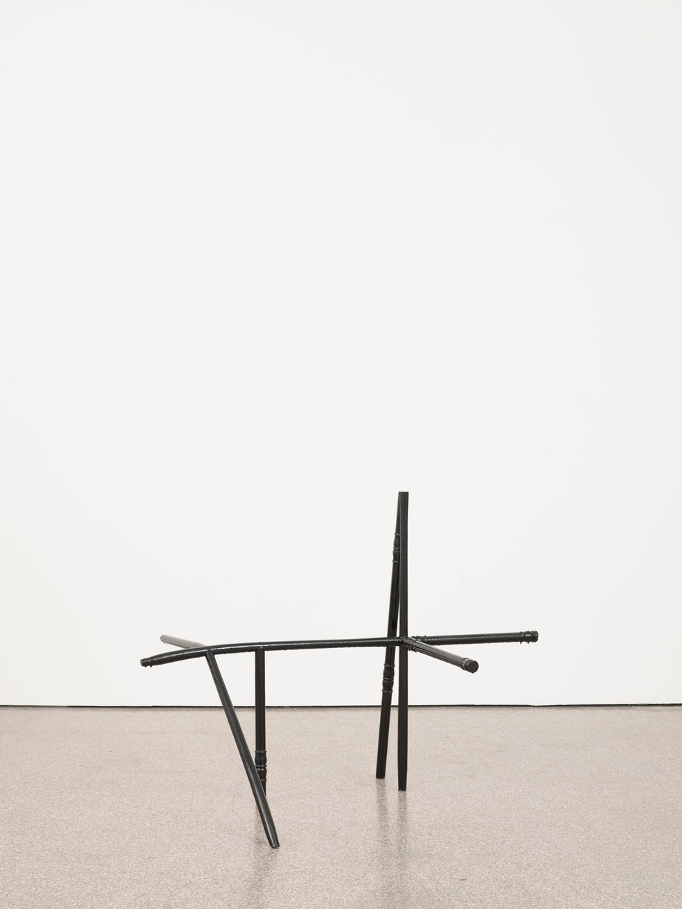 Conceived like a scale model, Jean-Luc Moulène’s fifth solo exhibition at Galerie Greta Meert addresses visitors and passerby alike. In a series of assemblages titled with the affirmation OUI, the artist combines axe handles, shovel sticks, turned wood pieces and dibbers into non-hierarchal structures. The handles that usually give objects their orientation are turned inward, imbricated, and joint together. These multidirectional structures populate the street-level gallery space like loosely untangled knots, they are at once selfcontained and rhizomatic — visual manifestations of thought made tangible. Positioned in-between all things, his assemblages act as transmitters, they create links without ligatures. With different ink colours and resin coatings, these two and three-dimensional constructions evoke the practice of drawing by delineating pictorial planes and mapping out architectural volumes.