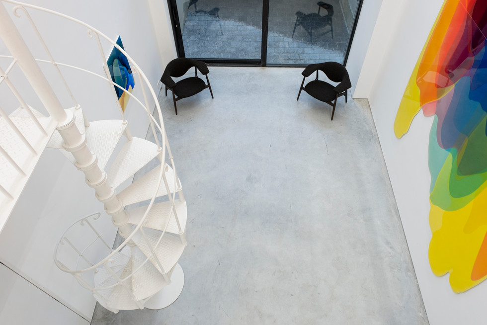 His epoxy paintings are based on images found on the Internet or from his own archives, which he digitally reworks and transposes onto the canvas in successive layers. Oscillating between transparency and depth of field, the resulting works are reminiscent of the colourful, glowing surfaces of computer screens.